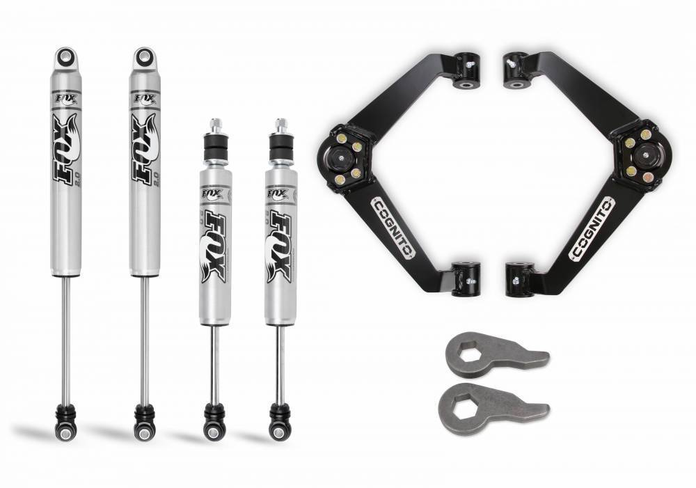 The Cognito 3 Inch Performance Leveling Kit includes the Cognito Ball Joint SM Series Upper Control Arm Kit, Torsion Bar Adjuster Keys, front and rear Fox Performance Series Monotube shocks and front shock spacers to maximize droop travel.