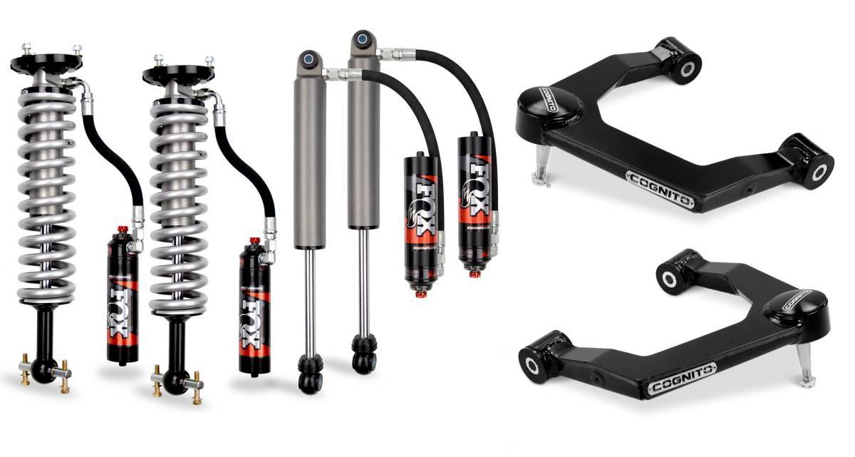The Cognito 3-Inch Elite Leveling Kit includes the Cognito SM Series Upper Control Arm Kit, Fox 2.5 Performance Elite Series Remote Reservoir Coilover front shocks, and Fox 2.5 Performance Elite Series Remote Reservoir rear shocks.