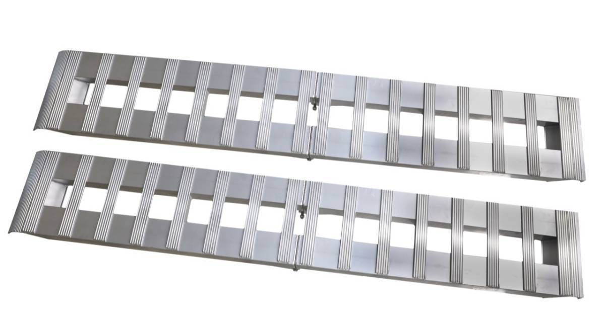 These foldable aluminum loading ramps are a multi-piece ramp system designed for loading vehicles or other wheeled equipment onto docks, trucks, or trailers. Their lightweight aluminum construction makes them lightweight and portable without sacrificing any toughness! Plus these fold from 8' to 4' and can be stored in a short bed truck!