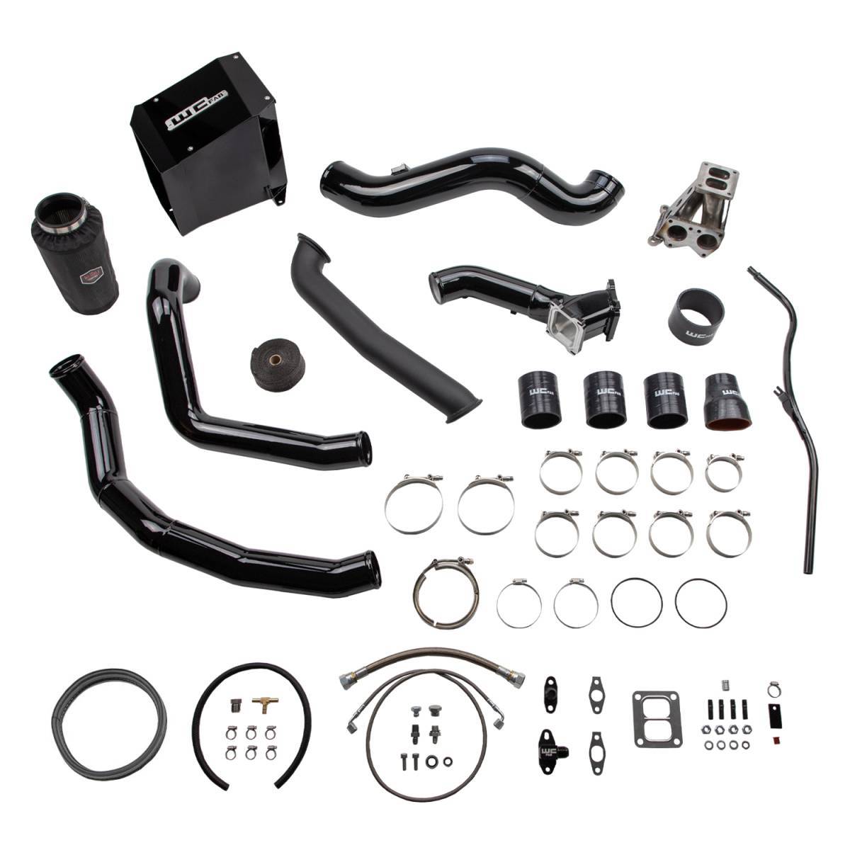 This single fixed vane turbocharger install kit from WCFab for 2001-2004 Chevy Silverado 2500 / 3500 HD trucks contains what you need to swap from your stock IHI style turbo to a larger frame Borg Warner S300 style setup on a 6.6L LB7 Duramax diesel engine. Upgrades your existing air cleaner setup to a 4" fabricated aluminum intake with heavy duty sheet metal air box and high performance dry filter with pre-filter cover. Intercooler hot and cold side charge pipe plumbing are also updated to high flow 3" diameter mandrel bent 14 gauge aluminum tubes. Includes our upgraded high flow 3" fabricated billet y-bridge kit which replaces the restrictive stock upper intake manifold to finish off the air flow path into the engine and allow for maximum horsepower and efficiency gains. Supplied Oil Lines are high-quality stainless steel braided Parker Lines with the oil feed line routing from the main oil galley on the side of the engine block. A variety of popular turbo size options (sold separately) mount to a T4 fabricated steel pedestal with spacer which is compatible with our 2" high flow stainless steel up pipes. Included high temp ceramic coated turbo downpipe connects to your existing exhaust front pipe V-Band clamp. This simplifies installation and requires NO cutting or modification to your exhaust system.