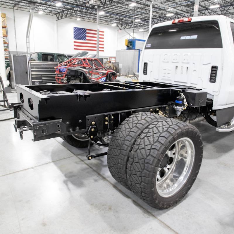 The front and rear of the frame rail c-channel include side mounting ears for a complete bolt on installation to your chassis. No welding to the chassis (Welding is NOT recommended per the chassis manufacturer)! Three crossmembers of the bed rail extension kit feature openings for ease of routing any fuel lines, wiring, or other accessory items like air suspension components and add additional rigidity to the extension assembly. The rails also offer additional area to your build to include your own custom cross members or bracketry to support other aftermarket upgrades and options, IE the dual air tanks shown in above picture hung from additional angle iron cross members (Air Tanks and their accompanying angle bracket are not included with this kit).