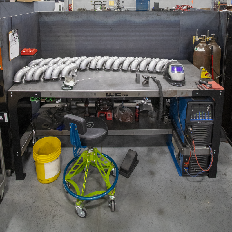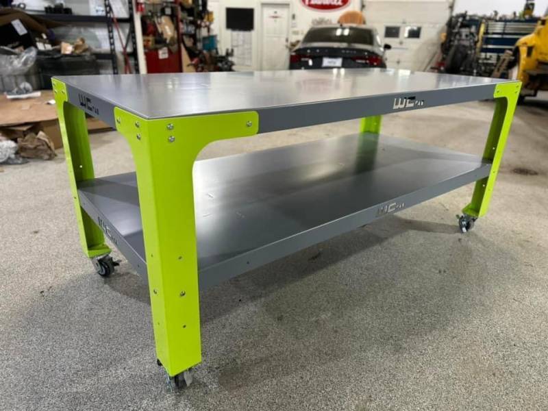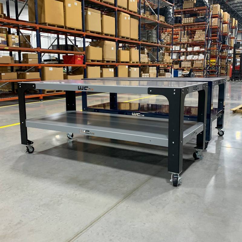 How tough are they? Rated for 3,000 lb max capacity (evenly distributed) using optional leveling feet or 1,500 lbs (evenly distributed) when fitted with the full swivel or combination swivel and solid caster options, these tables are built to work and look good doing it. So much so in fact, that we use them in every department in our shop - from machining to fabrication, powder coating prep to automotive performance and repair, and right down to final assembly and shipping.