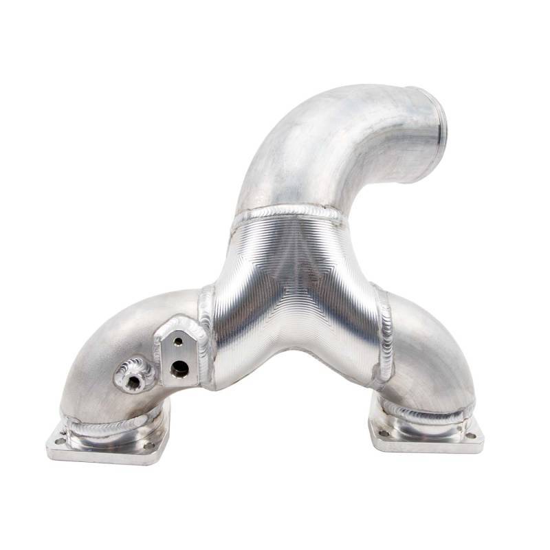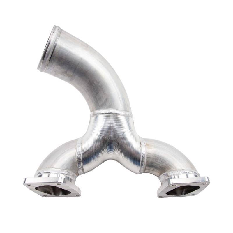 3.5" High Flow Y-Bridge for custom build racing applications only. Bolts to OEM intake runners. 3.5" Bead Roll Connection at inlet. 14 ga Aluminum neck and TIG welded CNC machined billet aluminum center section and flanges. Includes bungs for MAP sensor installation and 1/8" NPT accessory port. Raw finish ready for polishing or painting standard. Custom Color Powder Coat finishes are available as an optional upgrade and carry additional lead time.
