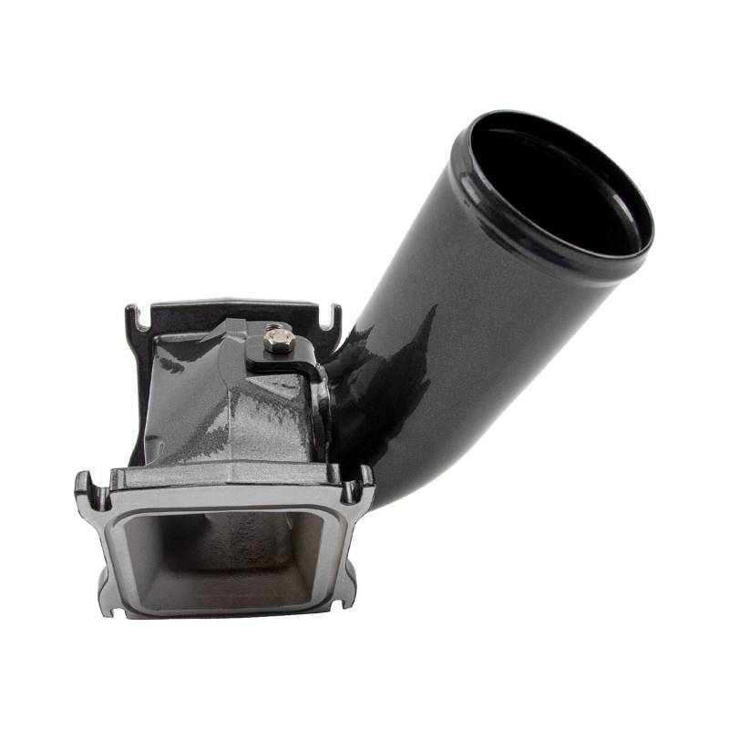 Bolts to OEM intake runners. 3" Bead Roll Connection at inlet. Easy to install two piece bolt together design replaces separation / boost leak prone OEM part. Raw finish ready for polishing and painting standard. Custom Color Powder Coat finishes (as shown) are available as an optional upgrade and carry additional lead time.
