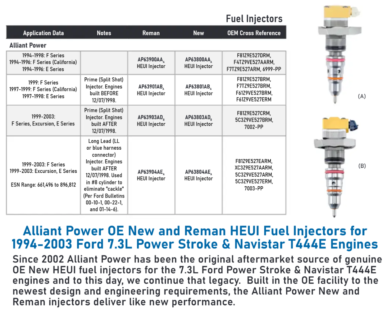 Since 2001 Alliant Power has been the original aftermarket source of genuine OE New HEUI fuel injectors for the 7.3L Ford PowerStroke & Navistar T444E and to this day, we continue that legacy. Built in the OE facility to the newest design and engineering requirements, the Alliant Power Reman injectors deliver like new performance.