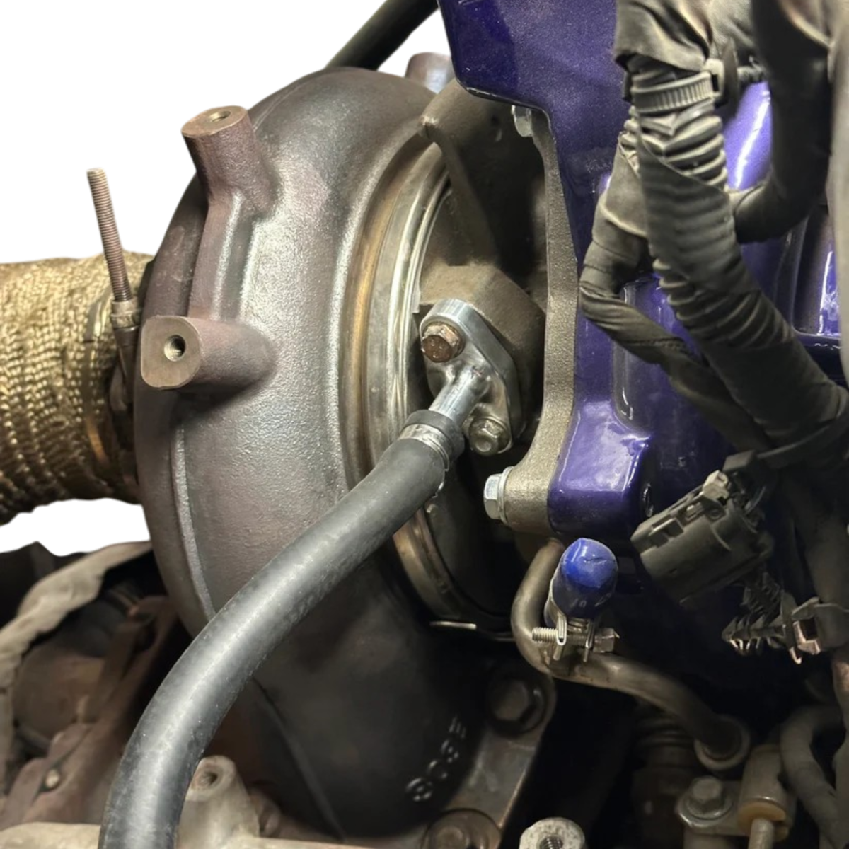 As these L5P's age, and get more heat cycles through them, things tend to break down, and a factory part that has shown to have failures, is the factory coolant tube off the left hand side of the turbocharger. This line ends up breaking near a welded area towards the bolted flange (see below).