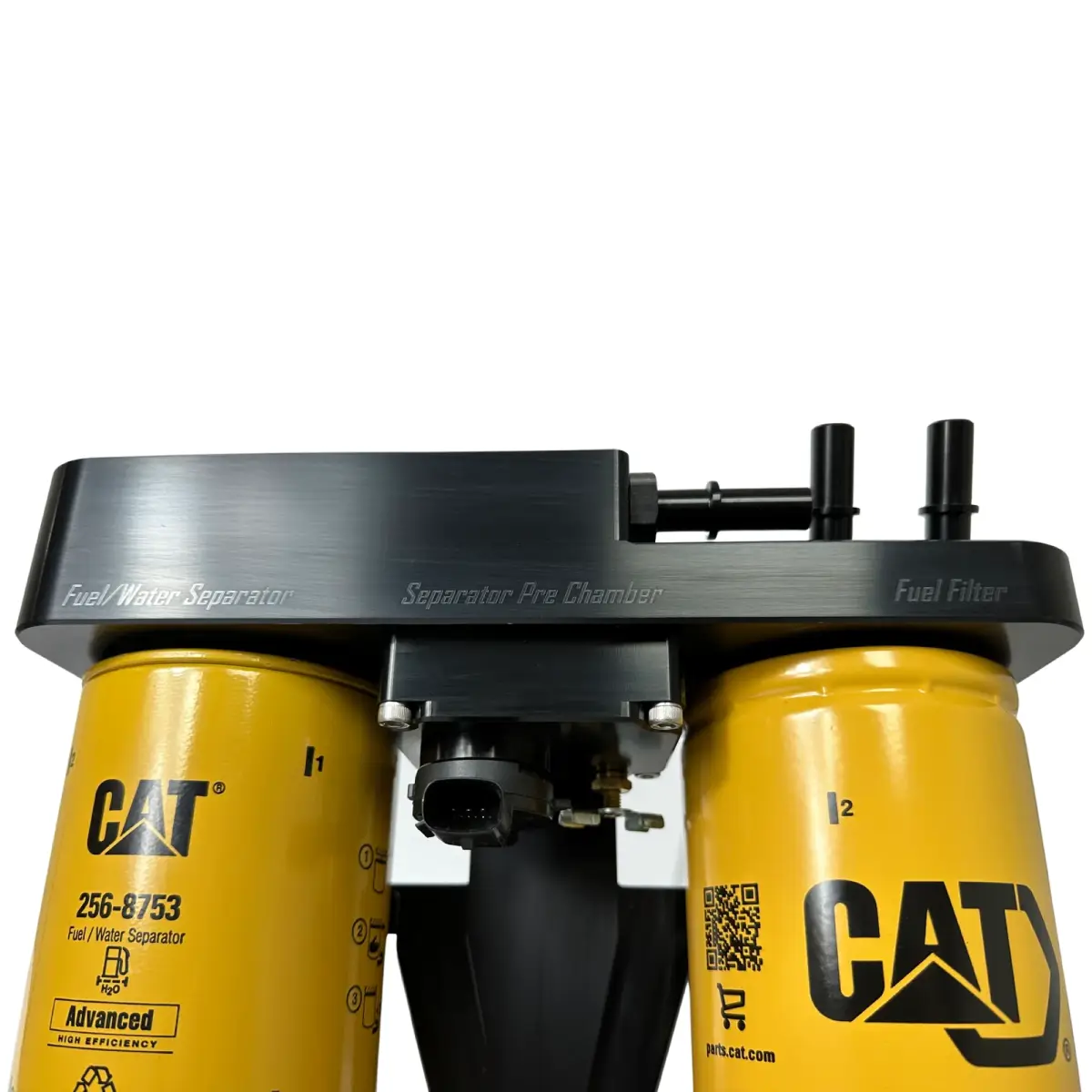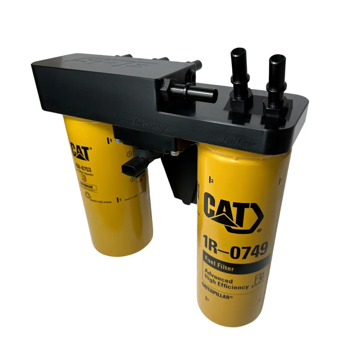 For the main filter side, SPE uses the CAT 1R0749 as the fuel filter which is 2 microns as opposed to the 4-micron factory filter, adding 3 times more filter area/volume and flow. The filter sizing and type were determined not only by filtration but also efficiency at high volumes of fuel flow for performance applications. This is something that should not be overlooked when your truck is making extra power. Now that the top filter is under the truck SPE provides a Fuel manifold to go in place of the stock filter. Utilizes all the factory lines and connections. Zero cutting or modifying. The manifold also adds auxiliary fuel ports. Not to mention it cleans up the top of the engine and makes it look and function better.