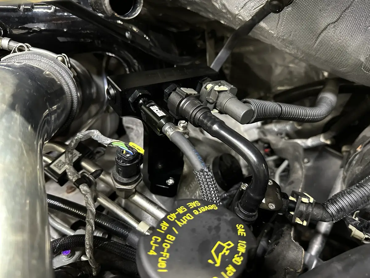 Upper Fuel Filter is Replaced with a Filter Delete Manifold to retain factory lines and routing under the hood.